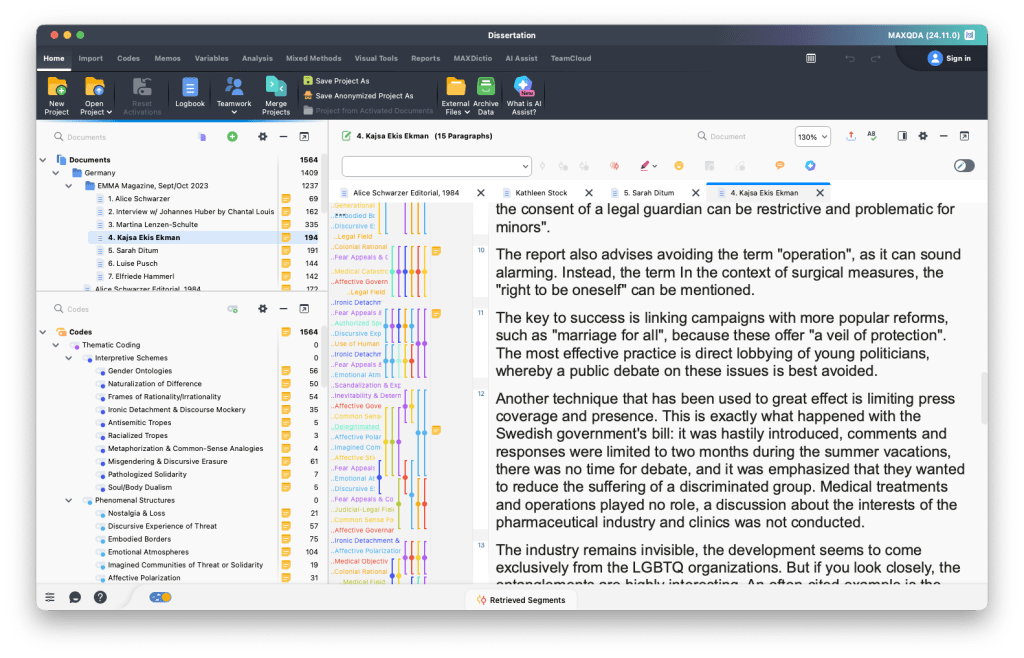 September 2025: data analysis in progress. Starting with texts from October 2023 issue of German feminist magazine EMMA. Mastering use of MAXQDA.